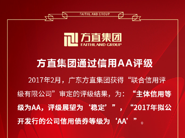 2017年2月,廣東方直集團(tuán)獲得“聯(lián)合信用評(píng)級(jí)有限公司”審定的評(píng)級(jí)結(jié)果,為:“主體信用等級(jí)為AA,評(píng)級(jí)展望為‘穩(wěn)定’”,“2017年擬公開發(fā)行的公司信用債券等級(jí)為‘AA’”。