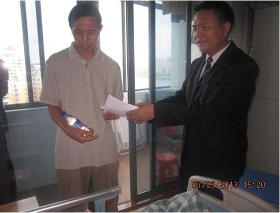 5月7日,方直物業總部、瓏湖灣物業服務中心一行3人前往惠州市第四人民醫院,看望遭遇車禍的員工家屬并獻上大家的一份愛心。遭遇不幸的是瓏湖灣物業服務中心電工吳紅寶的父親,其70歲的老父親于3月底在東江新城