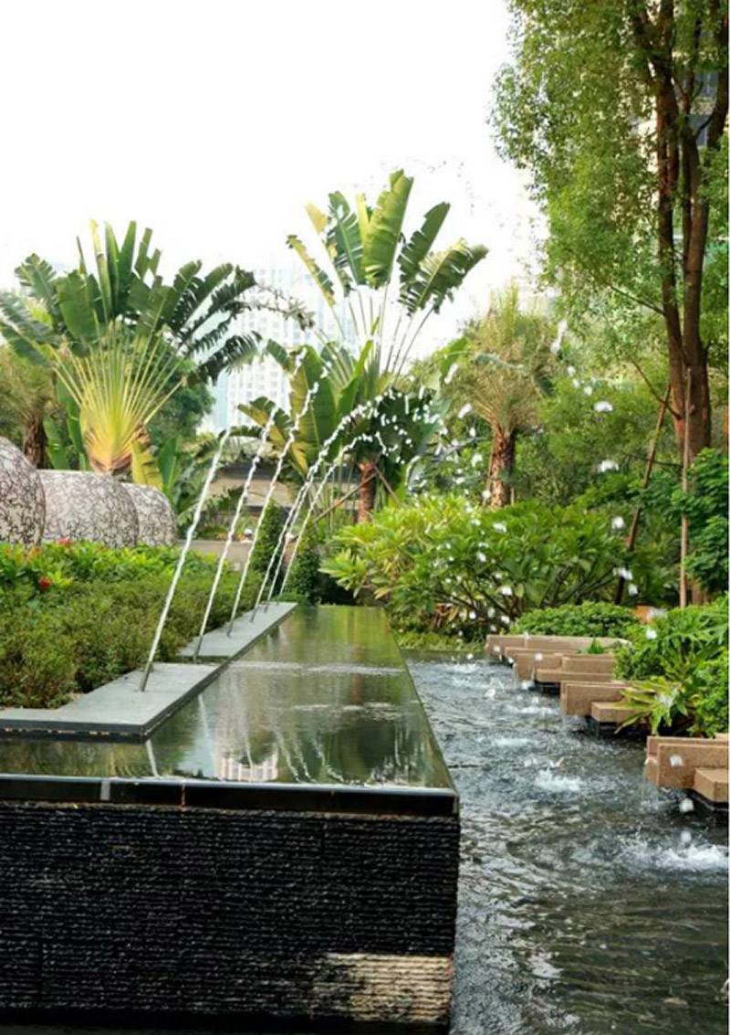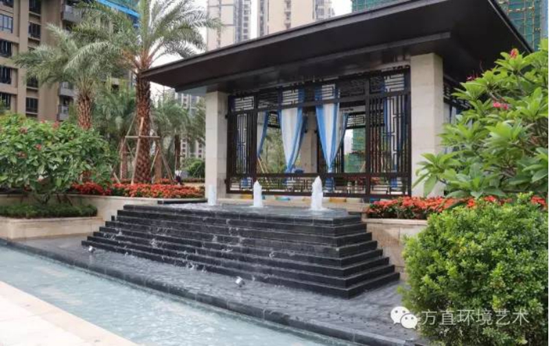 整個園林布局融合西式秩序與東方禮儀自東向西的四道疊級園林,超大無邊界泳池、亭臺、大片開闊草地、噴泉、小品、修剪幾何形體的綠籬,看似隨意卻富有韻律的小路,全都是完全的中軸對稱。