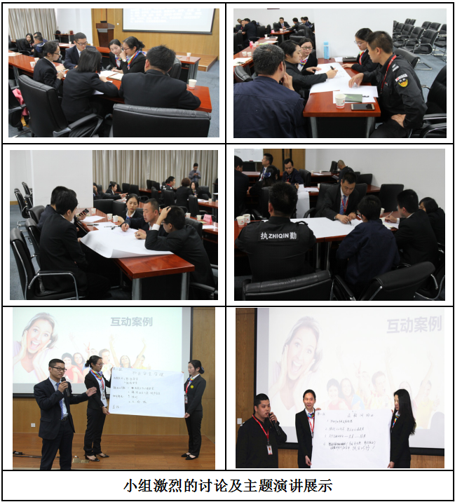 最后,張經理讓各小組充分討論選定一個跟物業相關的主題,要求深入剖析選題的原因、選題能解決的問題以及如何解決。各小組展開激烈的討論,集思廣益,不斷擦出新的火花,物業管理的創新點子和重點課題被各小組相繼提出:“互聯網+體驗式物業服務”、“物業服務如何增值”、“物業安全管理”、“樓宇巡查”、“違規裝修的隱患”、“360度客戶服務心態”,并由組長們激情飛揚向大家闡述觀點。張經理對每個課題和培訓的方式、優缺點都進行了詳細分析。