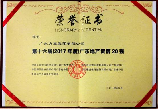 會上工、農、中、建四大國有銀行廣東省分行等機構正式對外公布了“第十六屆(2017年度)廣東地產資信20強”名單。該名單涵蓋了20家廣東本土龍頭房企,方直集團以守信創新的企業精神及成熟穩健的資產運作能力,再次蟬聯“廣東地產資信20強”稱號,成為連續四年蟬聯該項榮譽的房地產企業之一。