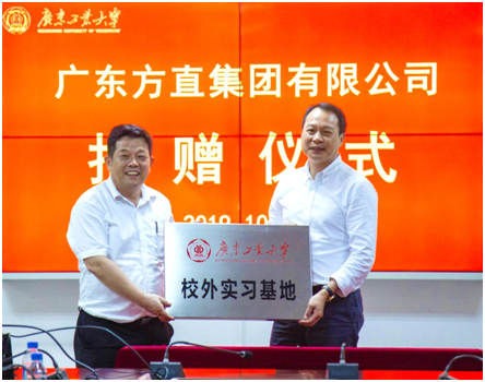 2019年10月9日,“方直獎學金”捐贈儀式在廣東工業大學大學城校區行政樓舉行。方直集團董事長陳專先生向學校捐贈1000萬元,廣工校黨委書記、校長陳新教授為方直集團頒發捐贈證書,并在方直設立“廣東工業大學校外實習基地”。